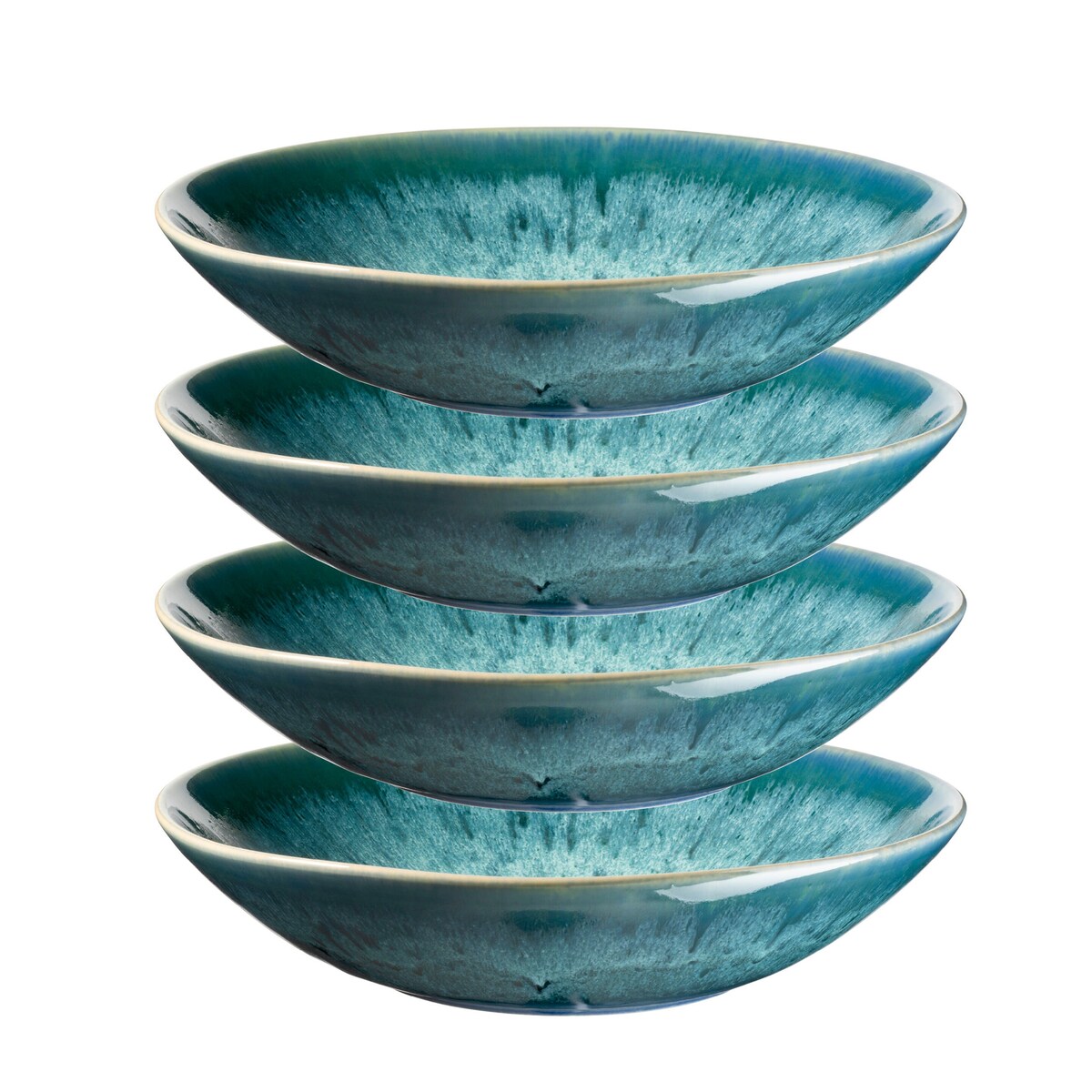 Mit einem Durchmesser von 23 cm bieten die Suppenteller ausreichend Platz für Suppen, Eintöpfe, Pasta oder Bowls. Die spezielle Reaktivglasur sorgt für faszinierende Farbverläufe und macht jeden Teller zum Unikat – ein spannendes Wechselspiel aus matten und glänzenden Oberflächen verleiht dem Set seine individuelle Note.