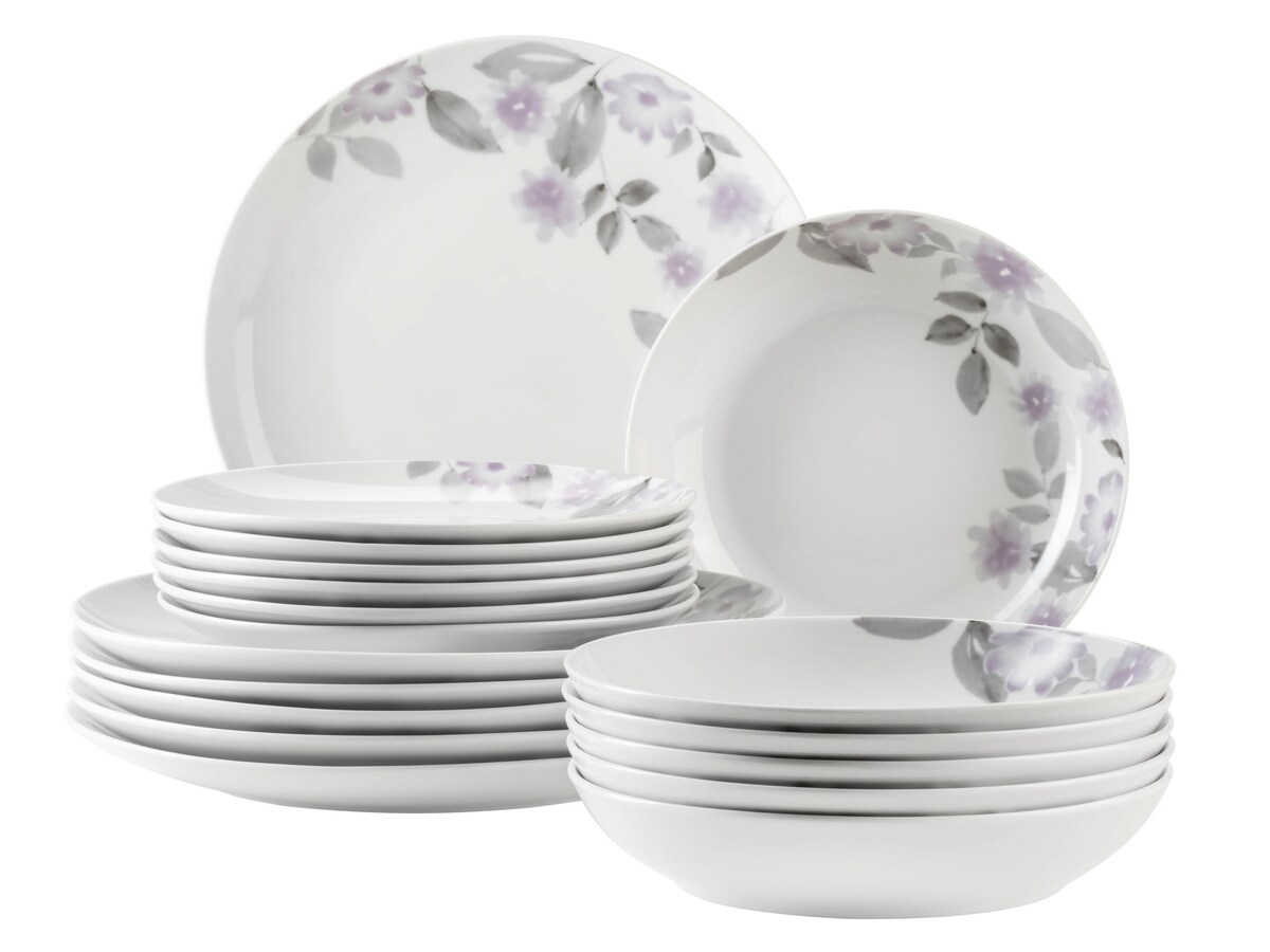 Bringen Sie frischen Blumenzauber auf Ihren Tisch – mit dem MÄSER Tellerset „Sono“ 18-teilig. Dieses stilvolle Geschirrset für 6 Personen besteht aus je 6 flachen Tellern, Suppentellern und Desserttellern. Das moderne Blumendekor in Flieder- und Grautönen auf edlem, weißem Porzellan wirkt romantisch und zugleich zeitgemäß.