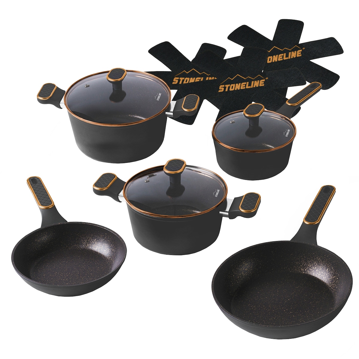 STONELINE – Das Original!Gesund fettfrei kochen und braten!Eleganz und Leidenschaft. Verleihe deiner Küche einen modernen, edlen Touch mit dem STONELINE Kochgeschirr-Set in Mattschwarz. Die eleganten Roségold-Details an den Deckeln und Griffen setzen stilvolle Akzente und bringen einen Hauch von Luxus in deine Küche. Die einzigartige Farbkombination von Mattschwarz und Roségold vereint schlichte Eleganz mit einem modernen, luxuriösen Design. Mit diesem Set machst du nicht nur dein Kochen noch mehr zum Erlebnis, sondern setzt auch ein Statement für modernes Design und stilvolles Kochen. Hol dir das perfekte Zusammenspiel aus Funktion und Ästhetik und lass deine kulinarischen Kreationen noch mehr glänzen!Dieses Set ist der perfekte Küchenhelfer für jeden Anlass. Egal, ob du schnell etwas braten oder ein aufwendigeres Gericht zaubern möchtest – mit den praktischen Töpfen, Pfannen und Deckeln hast du immer das richtige Kochgeschirr zur Hand und die Zubereitung deiner Lieblingsgerichte macht doppelt soviel Spaß.Die Glasdeckel mit Edelstahlrand in Roségold sind eine großartige Ergänzung zu deinem Kochgeschirr. Der Knauf der Deckel bleibt angenehm kühl, damit du dich während des Kochvorgangs nicht verbrennst. So wird das Kochen noch komfortabler und sicherer!Mit diesem Kochgeschirr-Set kannst du dich auf jede Mahlzeit freuen, die du mit Liebe und Kreativität zubereitest. Es bringt nicht nur Stil in deine Küche, sondern sorgt auch dafür, dass du dich beim Kochen voll und ganz auf den Geschmack konzentrieren kannst. Hol dir das Set und genieße das Kochen in vollen Zügen!Dank der speziellen STONELINE Antihaftbeschichtung in Goldoptik kannst du deine Speisen in den Pfannen und Töpfen – je nach Wunsch – mit oder ohne Bratfett und Öl zubereiten und sie ganz ohne Ankleben aus dem Kochgeschirr lösen.Es spielt keine Rolle, ob du auf Glaskeramik, Induktion, Elektro oder Gas kochst. In den Pfannen und Töpfen mit der original STONELINE Antihaftbeschichtung bleiben keine hartnäckigen Reste haften und die einfache Handwäsche spart dir Zeit und Mühe.Dieses Set besteht aus: 1 Bratentopf, ø ca. 24 cm, Höhe: ca. 12 cm, ca. 4,5 l, Induktionsboden: ø ca. 20,1 cm1 Kochtopf, ø ca. 20 cm, Höhe: ca. 10 cm, ca. 2,6 l, Induktionsboden: ø ca. 16,8 cm1 Stielkasserolle, ø ca. 18 cm, Höhe: ca. 8,3 cm, ca. 1,8 l, Induktionsboden: ø ca. 15 cm1 Bratpfanne, ø ca. 24 cm, Höhe: ca. 5,5 cm, ca. 1,9 l, Induktionsboden: ø ca. 18,8 cm1 Bratpfanne, ø ca. 20 cm, Höhe: ca. 4,5 cm, ca. 1,0 l, Induktionsboden: ø ca. 14,8 cm1 Glasdeckel, ø ca. 24 cm1 Glasdeckel, ø ca. 20 cm1 Glasdeckel, ø ca. 18 cm3 VliespfannenschützerIn der Farbe: Schwarz / RoségoldDie wichtigsten Vorteile auf einen Blick:Weltweit einzige Antihaftbeschichtung mit echten SteinpartikelnKratzfeste STONELINE-AntihaftbeschichtungGlasdeckel mit EdelstahlrandVitaminschonend kochen und braten ohne Fett und ÖlOptimales Bratergebnis und kross gebratenes FleischAuch für Vegetarier geeignet: Gemüse bleibt knackig und saftigKein Anbrennen und kein AnklebenSuper leicht zu reinigen dank Easy-Clean EffektExtra starker, verzugsfreier BodenBodenstärke: ca. 3,5 mmFür alle Herdarten geeignet, auch InduktionBackofengeeignet bis 150 °CMaterial: AluminiumReinigungs- und Pflegetipps:Vor dem ersten Gebrauch empfehlen wir, dein Koch- oder Backgeschirr mit etwas Wasser und einem milden Spülmittel gründlich auszuwaschen. Verteile anschließend mit einem Papierküchentuch einige Tropfen Speiseöl auf der Beschichtung.Bei der weiteren Nutzung kannst du auf den Einsatz von Fett oder Öl verzichten!Dank dem Easy-Clean-Effekt wird die Reinigung per Hand empfohlen. Einfach mit heißem Wasser, Handspülmittel und einem weichen Schwamm auswischen.