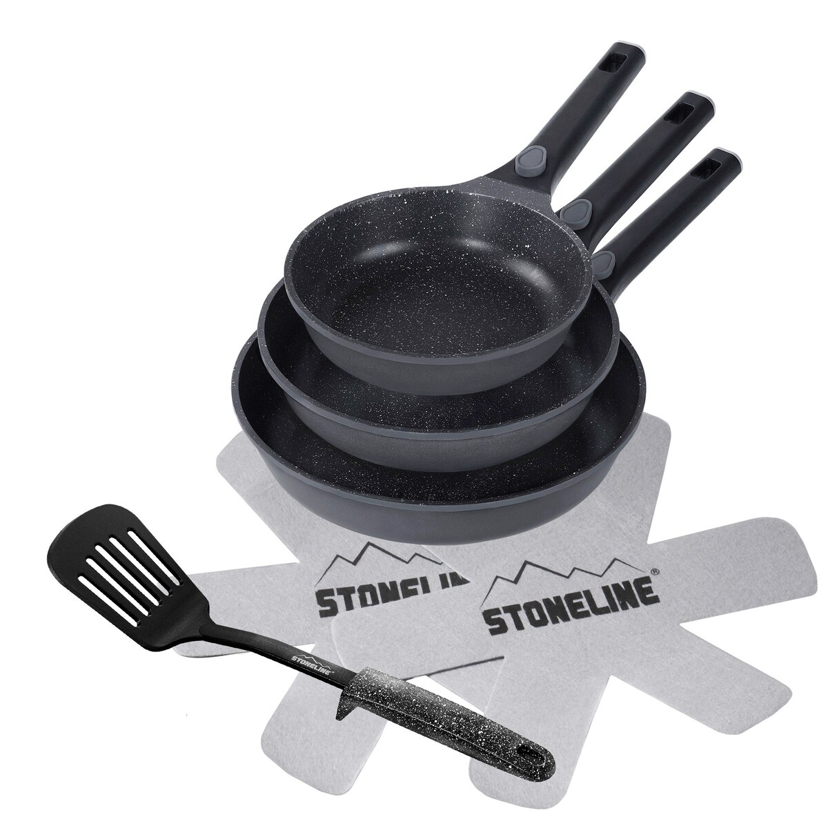 STONELINE – Das Original! Gesund fettfrei kochen und braten! STONELINE Smart – Das intelligente Kochgeschirr für deine Küche Mit der STONELINE Smart Serie wird Kochen, Backen und Servieren so einfach und flexibel wie nie zuvor! Das hochwertige Kochgeschirr aus Aluguss kombiniert durchdachte Funktionen mit modernem Design, langanhaltender Qualität und maximalem Komfort. Der abnehmbare Griff macht das Kochgeschirr besonders vielseitig: Spare Platz bei der Zubereitung auf dem Herd, beim Servieren auf dem Esstisch und bei der Aufbewahrung im Kühlschrank. Außerdem wird dein Kochgeschirr mit abgenommenen Griffen im Handumdrehen ofenfest. Du kannst die Pfannen beispielsweise als Auflaufformen zum Überbacken von Gerichten verwenden. Das spart Zeit und auch zusätzliches Koch- und Backgeschirr. Das Pfannenset bietet dir die Flexibilität, zwischen drei verschiedenen Größen zu wählen, sodass du immer die perfekte Pfanne für dein Gericht hast. Ein Pfannenwender und zwei Pfannenschützer zur sicheren Lagerung komplettieren das Set. Die Bratpfannen sind sehr geräumig und bieten ausreichend Platz, um auch größere Portionen problemlos zuzubereiten und zu wenden. So bleibt alles in der Pfanne und du kannst dein Gericht perfekt zubereiten, ohne dass etwas herausfällt. Ob Pfanne, Topf oder ganzes Topfset – die STONELINE Smart Serie überzeugt durch ihr robustes Aluminiumguss-Material und garantiert eine optimale Wärmespeicherung und ein energieeffizientes Kochen. Es ist für alle Herdarten geeignet, auch für Induktion. Dank der patentierten STONELINE Antihaftbeschichtung mit echten Steinpartikeln kannst du gesund fettfrei braten, ohne dass etwas haften bleibt oder anbrennt. Die Reinigung ist kinderleicht und spart dir Zeit – meist genügt es, die Pfanne oder den Topf einfach mit etwas Spülmittel, heißem Wasser und einem feuchten Tuch auszuwischen und das Kochgeschirr ist sofort wieder einsatzbereit. Lieferumfang: 1 Bratpfanne, ø ca. 20 cm, Höhe: ca. 5 cm, ca. 1,2 l, Induktionsboden: ø ca. 14 cm1 Bratpfanne, ø ca. 24 cm, Höhe: ca. 5,5 cm, ca. 2,0 l, Induktionsboden: ø ca. 16 cm1 Bratpfanne, ø ca. 28 cm, Höhe: ca. 6 cm, ca. 3,0 l, Induktionsboden: ø ca. 20 cm In der Farbe: Grau 2 Pfannenschützer, ø ca. 38 cm1 Pfannenwender, Länge ca. 33 cm Die wichtigsten Vorteile auf einen Blick: Weltweit einzige Antihaftbeschichtung mit echten Steinpartikeln Kratzfeste STONELINE-Antihaftbeschichtung Abnehmbare Griffe für flexible Einsatzmöglichkeiten Vitaminschonend kochen und braten ohne Fett und Öl Optimales Bratergebnis und kross gebratenes Fleisch Auch für Vegetarier geeignet: Gemüse bleibt knackig und saftig Kein Anbrennen und kein Ankleben Super leicht zu reinigen dank Easy-Clean Effekt Extra starker, verzugsfreier Boden Bodenstärke: ca. 4,5 mm Für alle Herdarten geeignet, auch Induktion Backofengeeignet bis 260 °C (ohne Griff) / 220 °C (mit Griff) Material: Aluminiumguss Reinigungs- und Pflegetipps: Vor dem ersten Gebrauch empfehlen wir, dein Koch- oder Backgeschirr mit etwas Wasser und einem milden Spülmittel gründlich auszuwaschen. Verteile anschließend mit einem Papierküchentuch einige Tropfen Speiseöl auf der Beschichtung.Bei der weiteren Nutzung kannst du auf den Einsatz von Fett oder Öl verzichten!Dank dem Easy-Clean-Effekt wird die Reinigung per Hand empfohlen. Einfach mit heißem Wasser, Handspülmittel und einem weichen Schwamm auswischen.