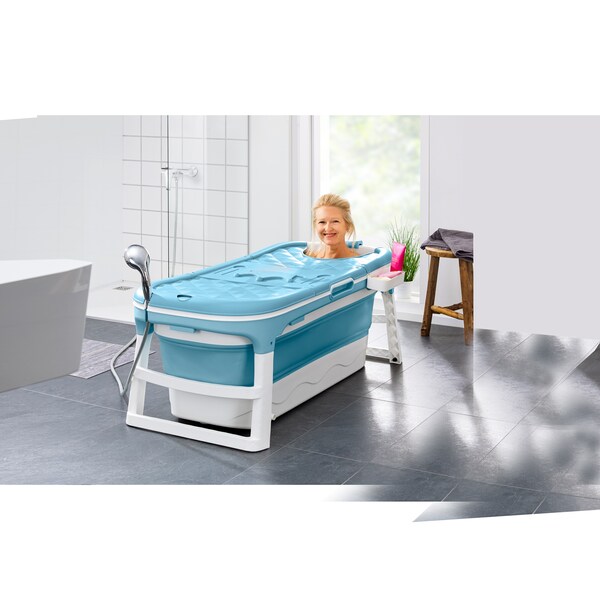 Erleben Sie pure Entspannung ohne Badewanne! Diese platzsparend verstaubare Badewanne ist Ihre Lösung für genussvolles Abtauchen im Alltag. Mit einer abnehmbaren Abdeckung, die die Wärme speichert, bietet sie dank des ergonomischen 108°-Winkels und 8 Massagerollen für die Füße langanhaltenden Komfort. Eine Kopfstütze, eine Ablage für Handy, Tablet und Getränke, eine Duschkopfhalterung und 2 Ablauföffnungen für das Wasser machen das Erlebnis perfekt - ideal für den Einsatz im Garten, auf dem Balkon oder beim Camping, sogar zum Duschen von Haustieren.