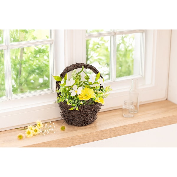 Wenn man einen Korb bekommt, dann bitteschön diesen! Gefüllt mit einer naturgetreuen Auswahl an Blumen und Blättern, sorgt er für natürliche Frische und macht jeden Raum zu einem einladen- den Ort.